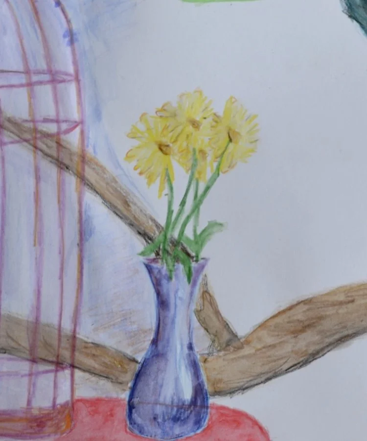A watercolor painting of a purple vase with yellow flowers on a red surface, with a background of a pink and purple ladder and intertwined brown branches.